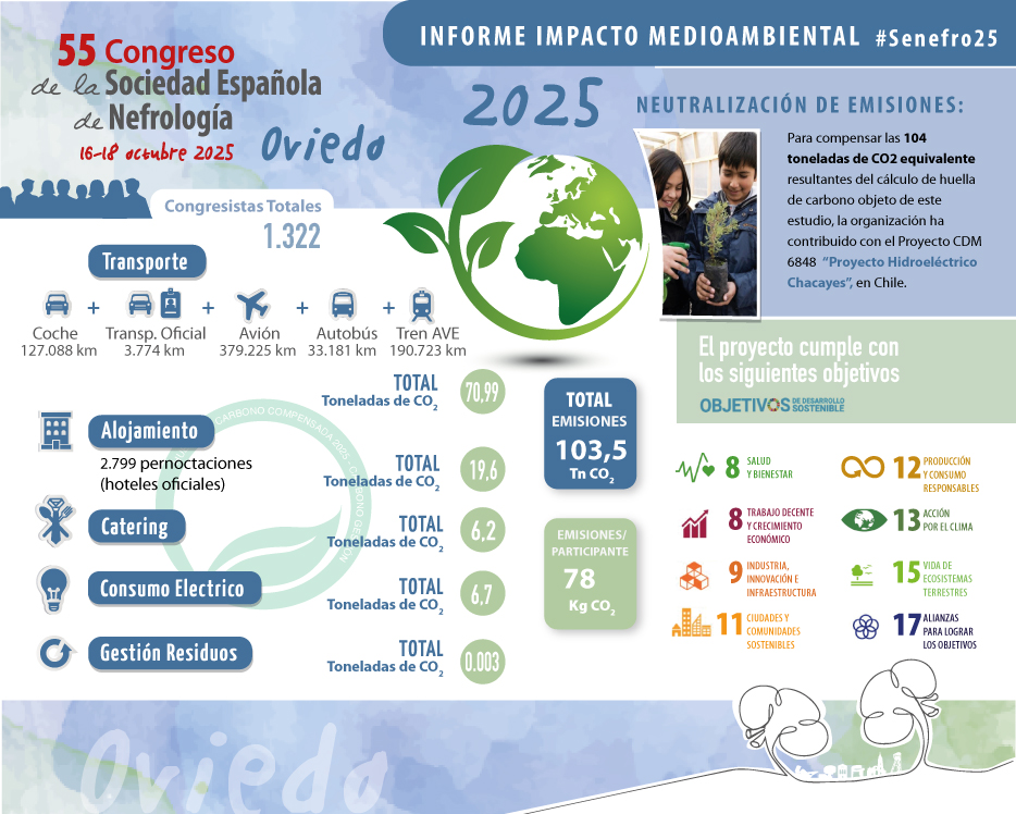 Como ya se puso en marcha durante el 52 Congreso de la S.E.N. 2022 en Granada, el Congreso ha continuado avanzando en su estrategia climática. En esta nueva edición de 2025, celebrada en el Palacio de Exposiciones y Congresos de Oviedo del 16 al 18 de octubre, y organizada nuevamente por Aforo Congresos, el Congreso ha vuelto a reforzar su compromiso con la sostenibilidad mediante la identificación del impacto climático generado y la aplicación de medidas de reducción y compensación de las emisiones de gases de efecto invernadero.
